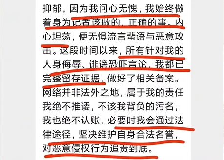 在博主晒出的聊天记录中,浙江跟队记者张书湉表示整个采访发布流程合规合法真实,没有一个字是杜撰。针对人身侮辱、诽谤恐吓言论已留存证据,必要时会通过法律途径维护自身合法名誉。